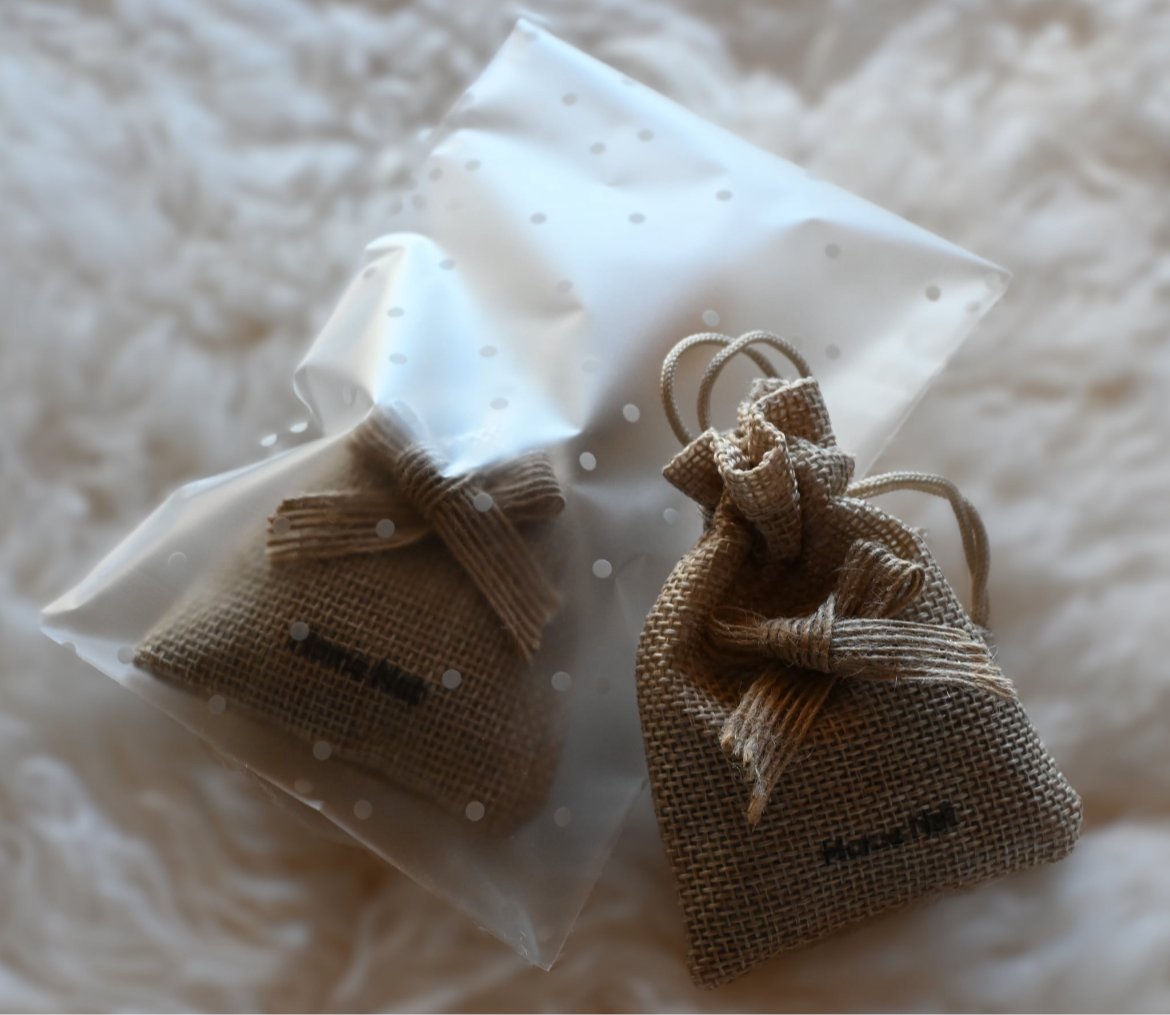 Le pochon parfumé est fabriqué à partir de toile de jute, de couleur marron.